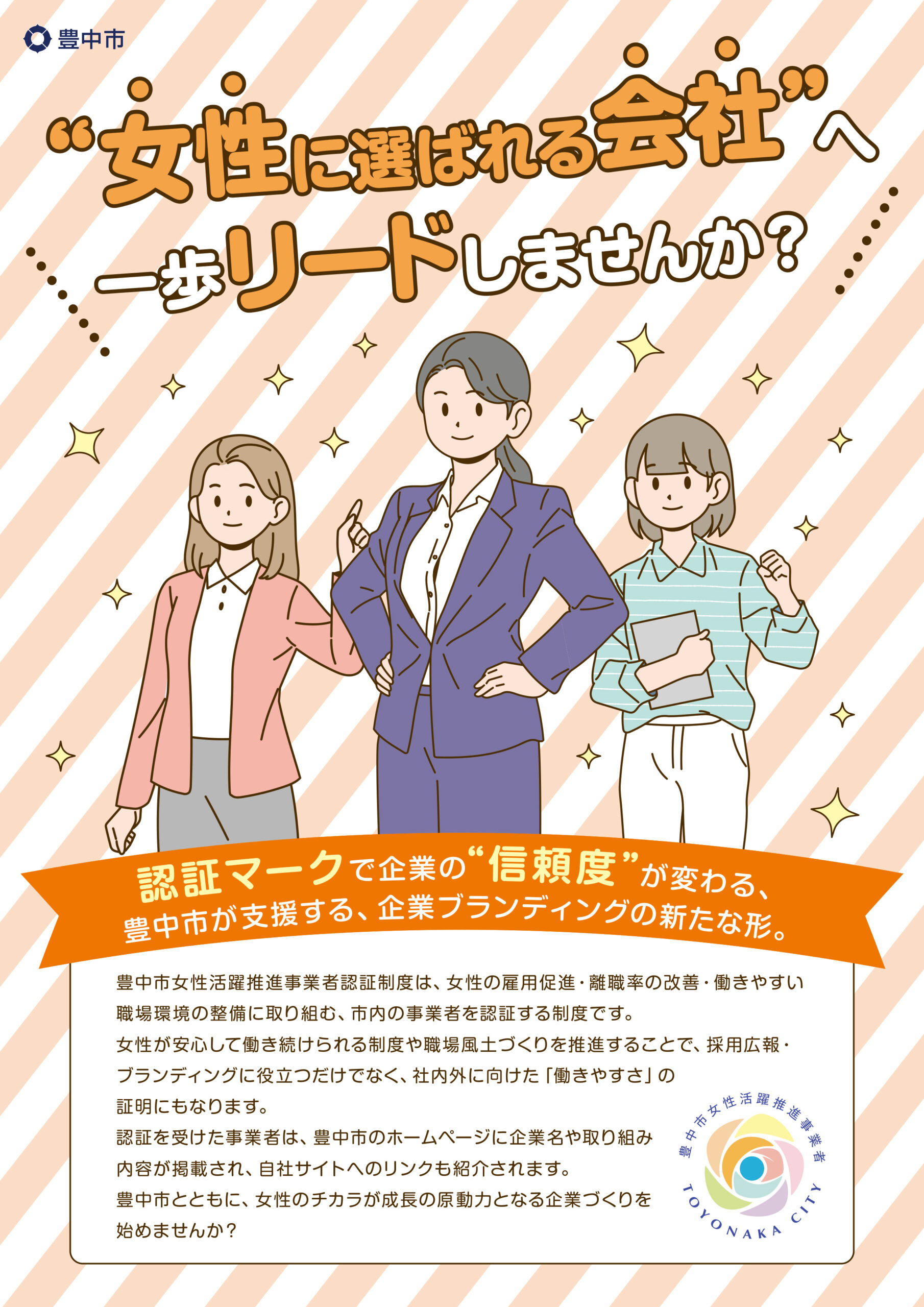 なお、豊中市は現在、大阪府内で大阪市を除き唯一、独自の「女性活躍推進事業者認証制度」を実施している自治体です。